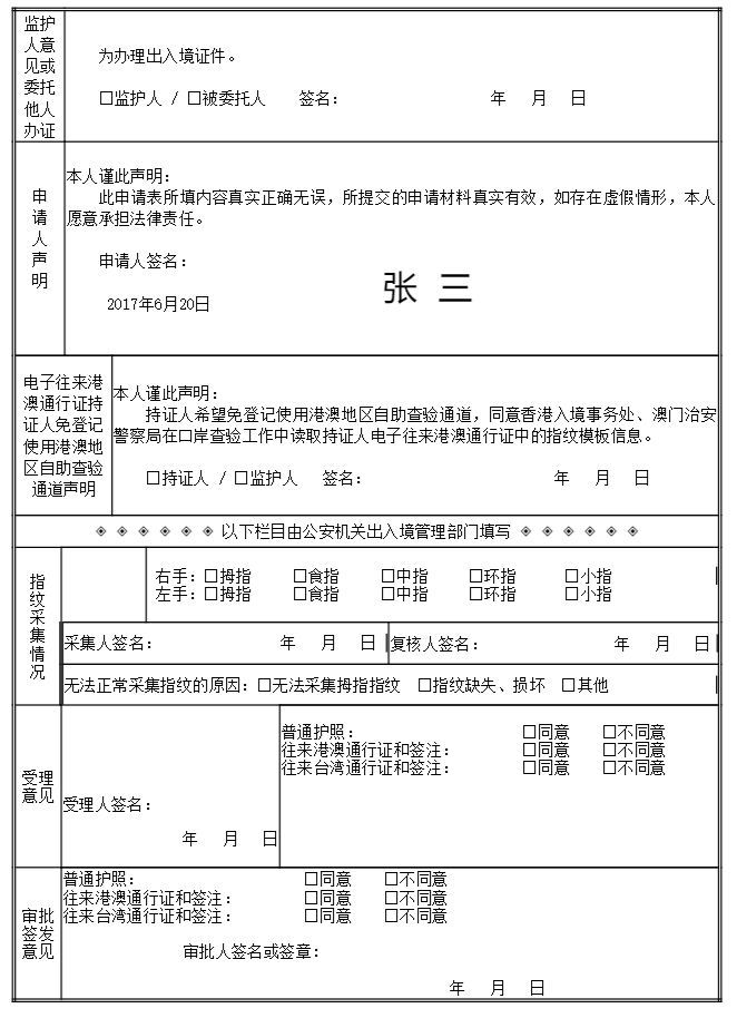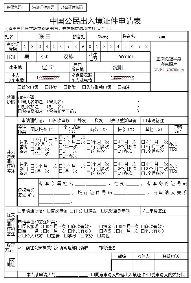 《中国公民出入境证件申请表》范本: