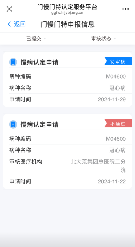 提交后,可查询审核状态及结果,并可随时通过黑龙江医保服务平台中的“我要查“或“服务”进行申报进度查询。