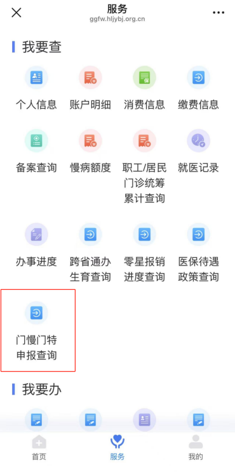 第一步,打开“龙江医保”公众号,点击“服务大厅”,进入黑龙江医保服务平台。