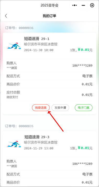 (2)选择“我的订单”功能,找到您希望退票的订单,符合赛事变更条件的订单会显示“我要退票”按钮,点击“我要退票”按钮,见图7;