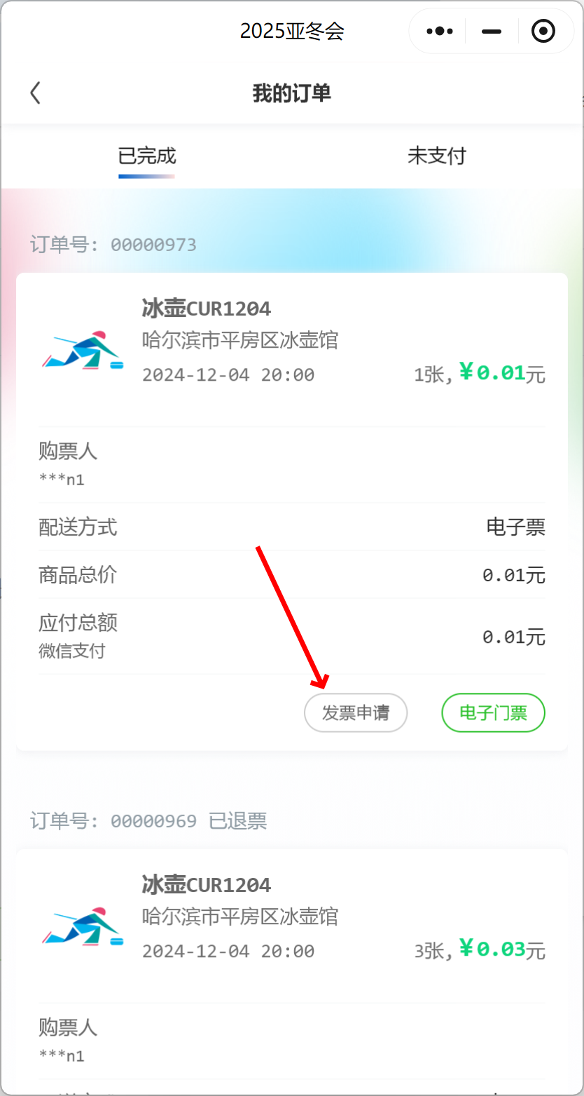 哈尔滨亚冬会购票成功后,申请发票的步骤如下: