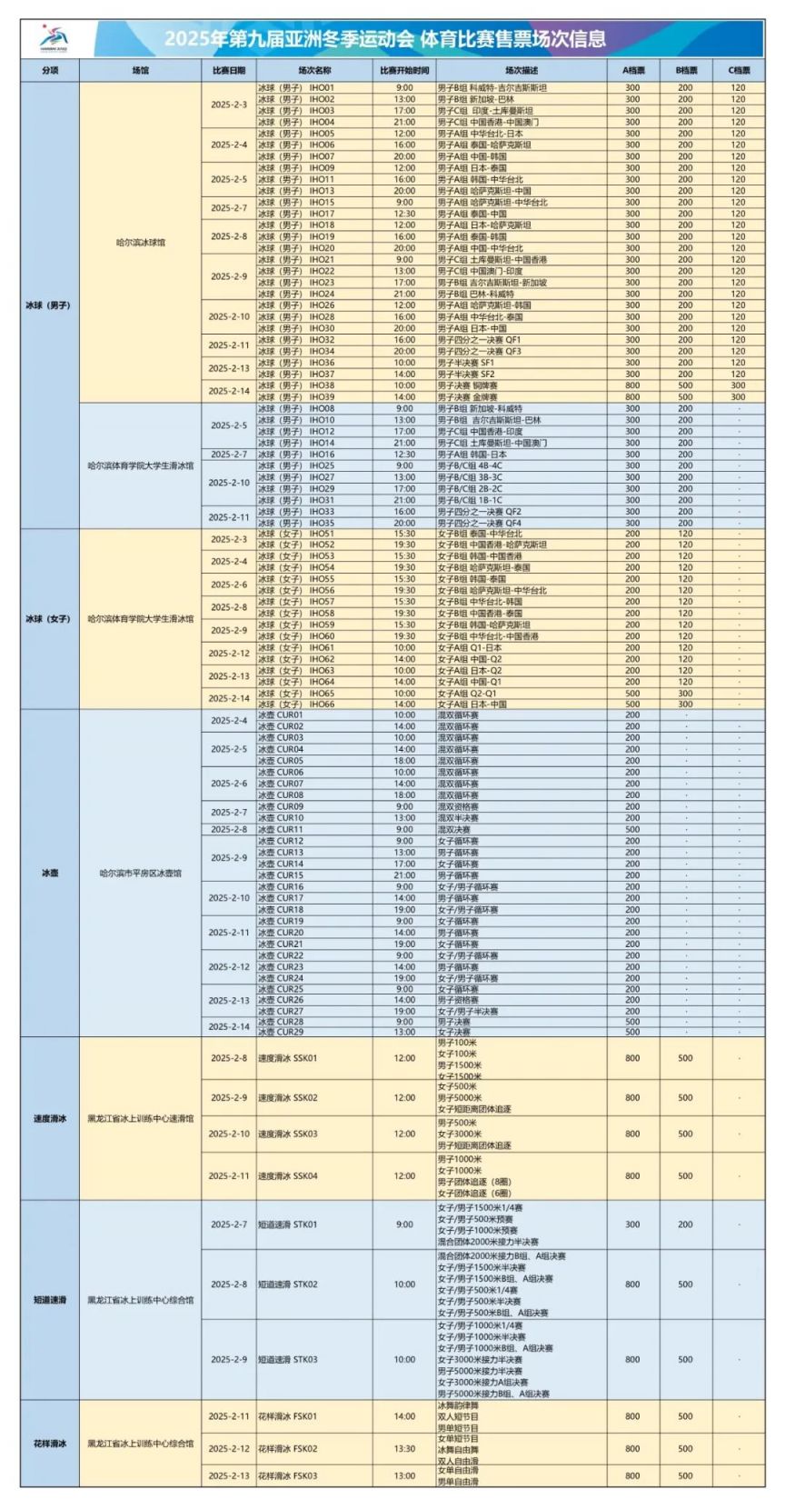为全面落实“简约、安全、精彩”办赛要求,哈尔滨亚冬会所有竞赛场馆都是对现有场馆进行改造利旧,座席数量有限,执委会尽最大可能为公众提供赛事门票。销售的门票包括了亚冬会全部冰上比赛项目:冰球、速度滑冰、短道速滑、花样滑冰和冰壶,共94个场次。